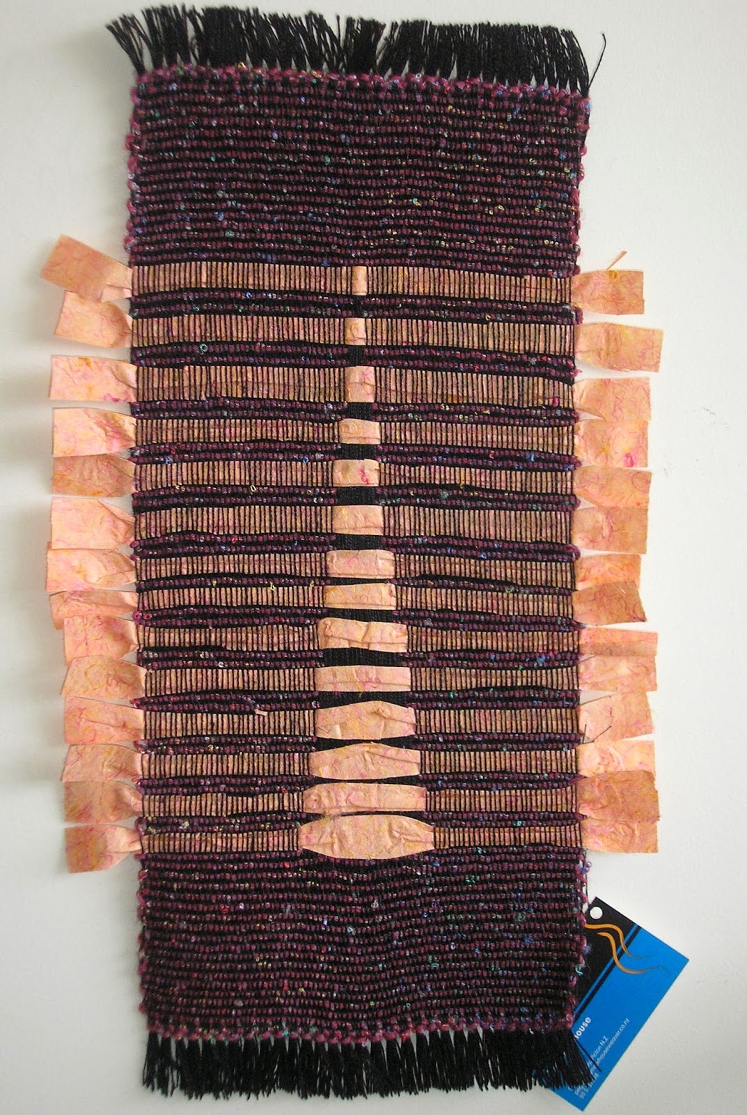 These hangings incorporate recycled sari silk fabric and unusual yarns.